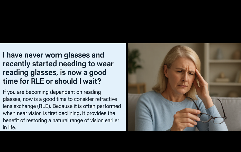 It discusses patient decision points: whether to opt for RLE sooner if one is already presbyopic or has early lens changes, versus waiting for cataracts to develop and selecting a premium intraocular lens (IOL) at that time.